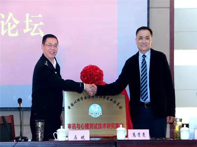 鉴于我院在审讯与心理测试领域的研究力量和成果,中国心理学会法制心理学专业委员会决定在我院成立“中国心理学会法律心理学专业委员会审讯与心理测试技术研究基地”,这也是中国心理学会法律心理学专业委员会在全国成立的首个研究基地,马皑和薛宏伟同志共同为学院研究基地揭牌。