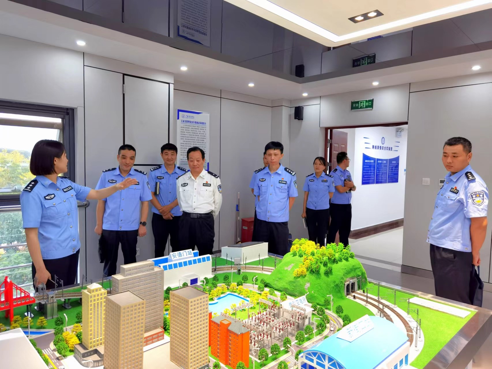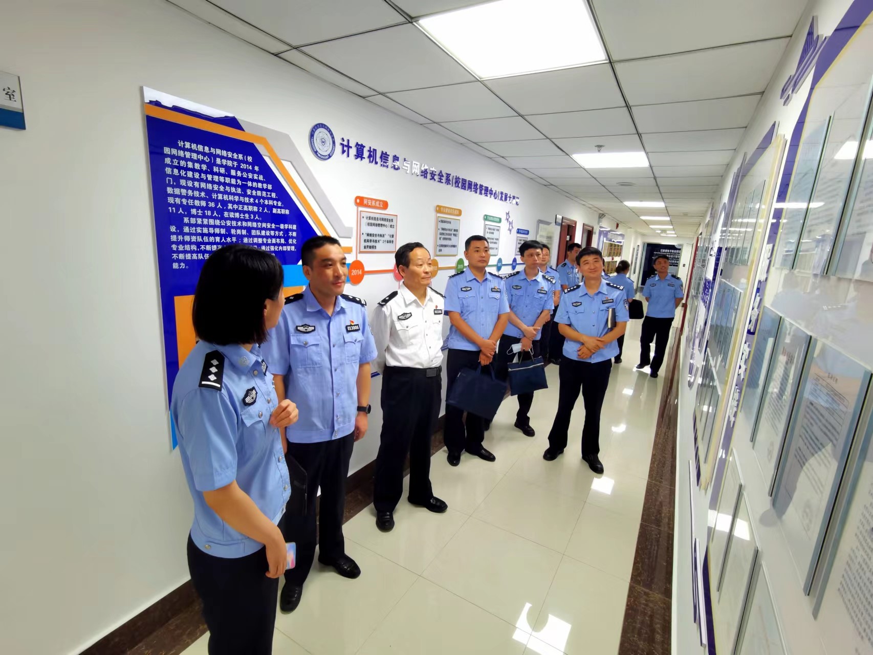 虞亚明大队长一行首先参观了网安系实训中心,包括电子数据取证分析工程研究中心、智慧警务联合创新中心、工业互联网安全实验室、网络攻防实训室、网络舆情实训室等,对我系实验实训平台建设及人才培养成效给予充分肯定。
