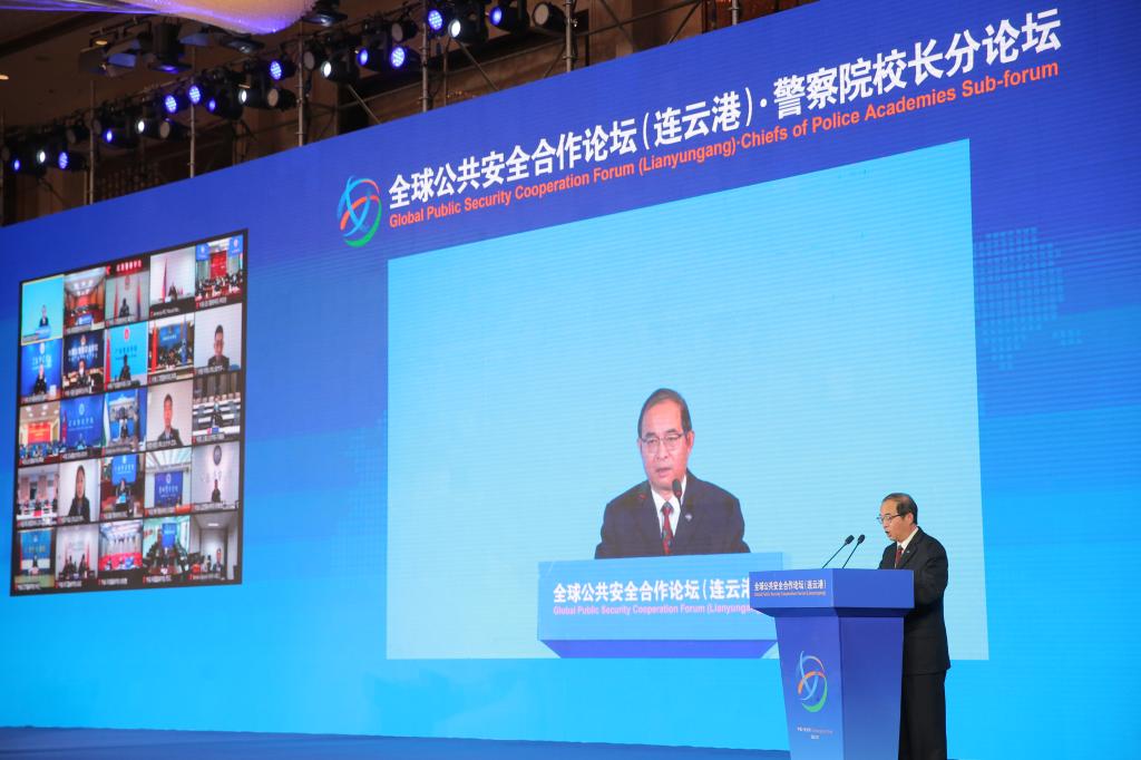 全球公共安全合作论坛(连云港)·警察院校长分论坛由中国人民公安大学承办,围绕“强化警察院校合作,提升安全治理能力”主题,邀请了25所境内警察院校、19所境外警察院校及外国驻华使领馆代表,100余位警察院校负责人和专家学者进行深入研讨交流。全球公共安全合作论坛首届大会主席、国家禁毒委员会副主任曾伟雄应邀出席,第十三届全国政协委员、社会和法制委员会副主任,中国友谊促进会理事长陈智敏,公安部国际合作局副局长牛海峰应邀出席并致辞,中国人民公安大学等8所国内外警察院校长作交流发言。