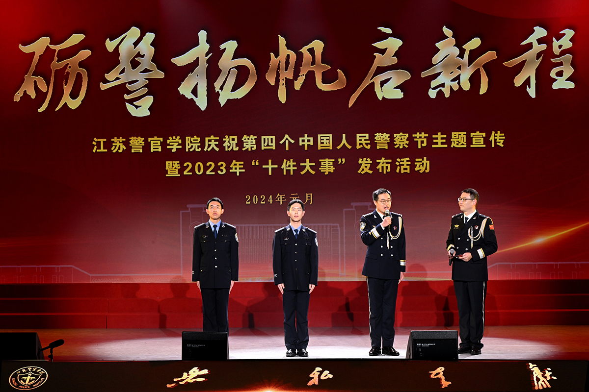 现场活动发布了江苏警官学院2023年十件大事:扎实开展学习贯彻习近平新时代中国特色社会主义思想主题教育,激励全体师生“牢记嘱托、感恩奋进、走在前列”;召开第四次党代会,奋力谱写江苏公安教育现代化新篇章;坚持用人民公安红色文化铸魂育警,“大思政课”建设成效明显;更高水平推进实战化教育教学改革,构建全警育人新格局迈出坚实步伐;公安学连续入选省优势学科,警察特色学科专业建设水平持续提升;加强有组织科研,警务研究服务公安实战成果丰硕;首届警务硕士研究生教育高标准起步,构建形成多层次多类型人才培养工作格局;育才引智构筑人才高地,高素质专业化教师队伍建设取得新成效;健全完善学生工作体系,推动学生工作全面加强;纵深推进全面从严管党治警,校园良好政治生态巩固发展。“十件大事”由学院组织师生推荐,经学院党委集体审定,从十个方面高度概括总结了学院2023年取得的突出业绩和创新成果。