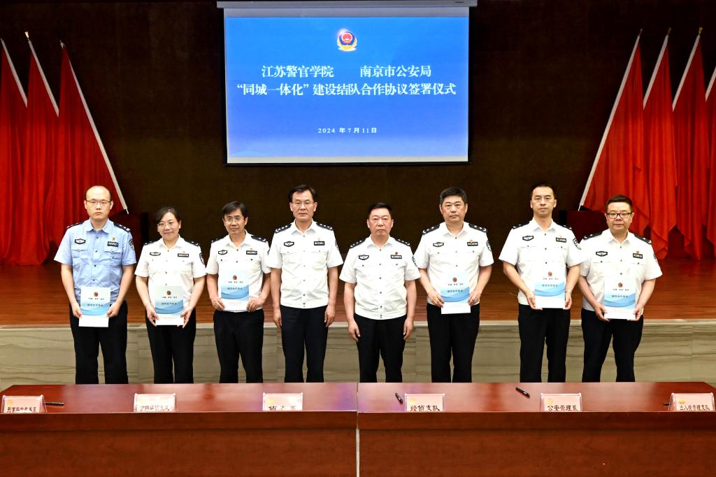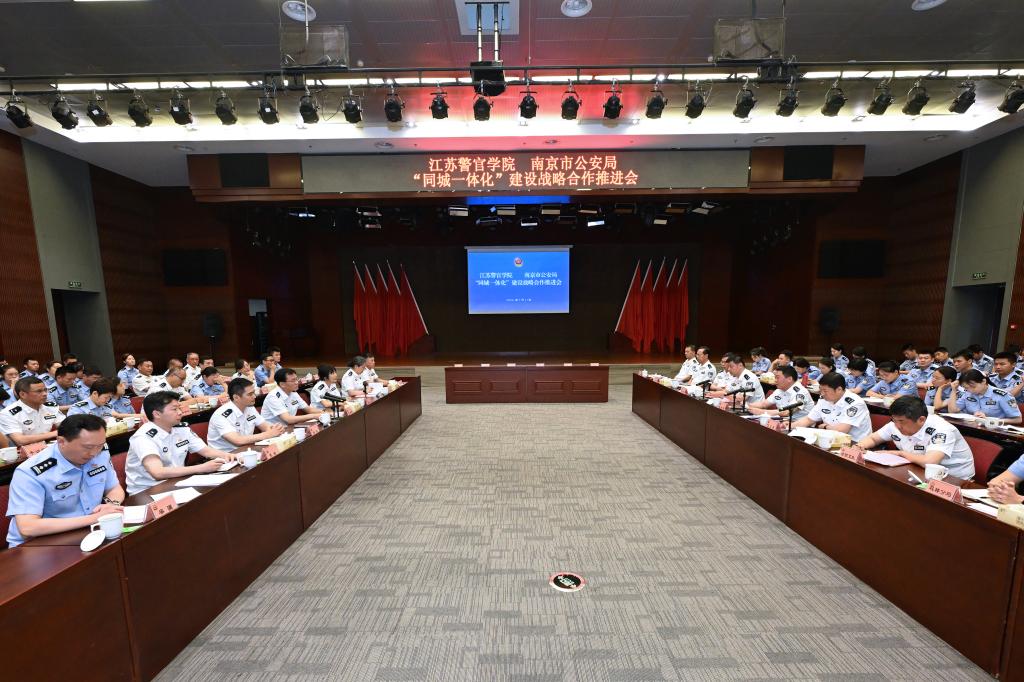 为深入学习贯彻习近平总书记关于新时代公安工作、教育工作的重要论述和对江苏工作的重要讲话重要指示精神,认真落实《中共中央关于推进公安工作现代化的意见》和全国公安工作会议精神,按照公安部、教育部关于加快推进公安高等教育高质量发展和省公安厅党委关于“全警办教育”的部署要求,进一步推动校局“同城一体化”建设走深走实,7月11日下午,学院与南京市公安局共同召开“同城一体化”建设战略合作推进会。省公安厅党委委员、学院党委书记夏存喜,省公安厅副厅长、党委委员,南京市副市长、市公安局局长常和平,学院党委副书记、院长黄进出席会议并讲话。省公安厅政治部副主任、组教处处长陆永出席会议。南京市公安局党委委员、政治部主任仇文庆主持会议。