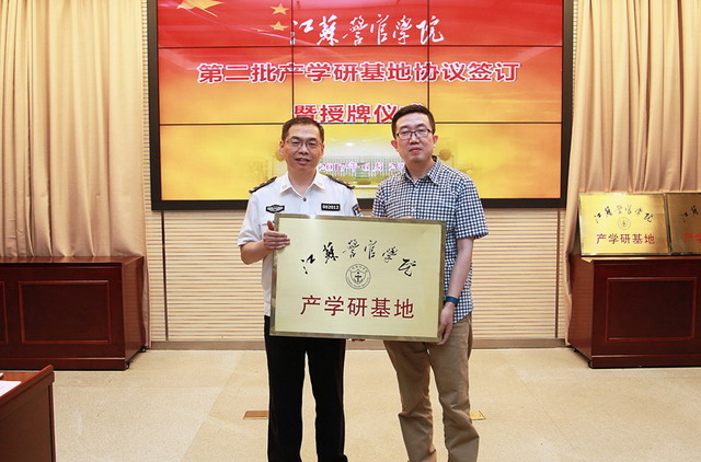 仪式上,薛宏伟副院长代表学院与4家企业的负责人签订了产学研基地合作协议,并分别授予“江苏警官学院产学研基地”铜牌。