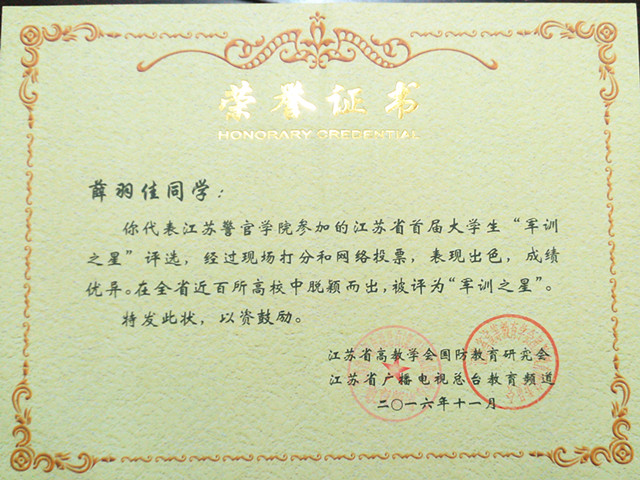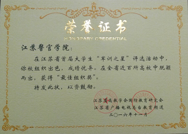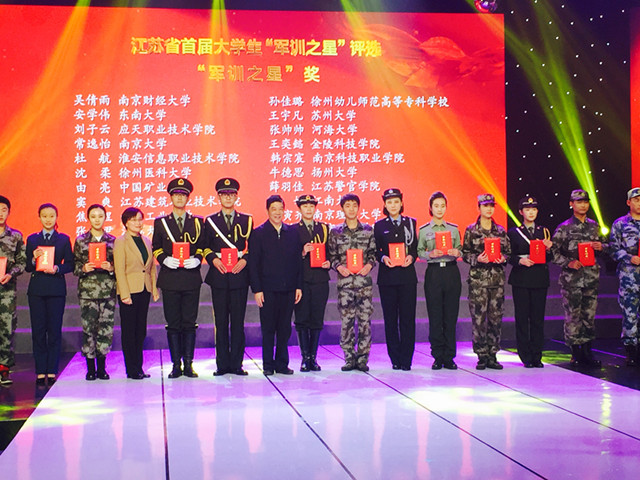 11月27日下午,江苏省首届大学生“军训之星”颁奖典礼在省广播电视总台举行。省教育厅副厅长朱卫国出席活动,92所高校的相关负责同志、指导教师和参赛选手参加了颁奖典礼。江苏警官学院获得“最佳组织奖”,我院2016级公安管理学一区队薛羽佳同学被评为江苏省首届大学生“军训之星”。