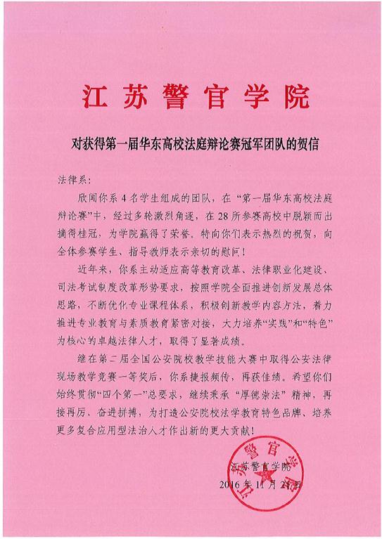 对获得第一届华东高校法庭辩论赛冠军团队的贺信