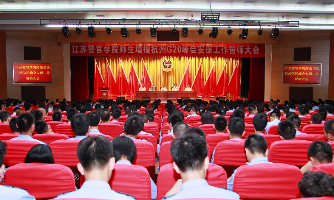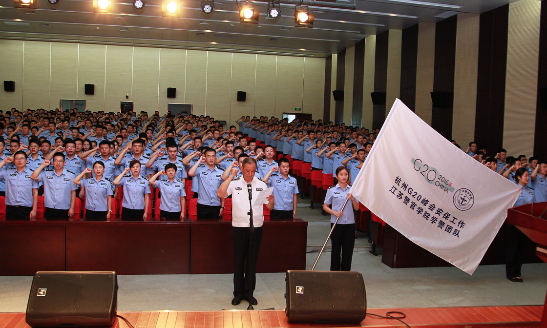 誓师大会上,张兰青院长和闫春雷主任分别为我院增援杭州G20峰会学警安保团队和交警支队学警安保团队授旗,安保团队带队教师代表和学生代表先后发言,安保团队全体师生进行了集体宣誓。全体参战师生警容严整、英姿飒爽,充分展现了苏警院师生听从指挥、能打胜仗的良好精神风貌。