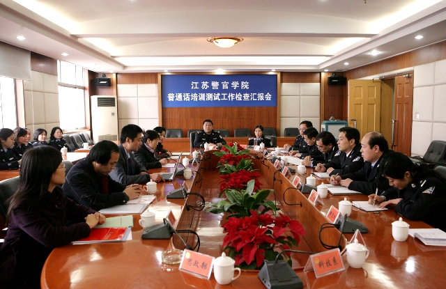 反馈会上,专家组组长胡强宣读了《全省高校普通话培训测试工作检查专家组赴江苏警官学院考察意见》。专家们经过认真研究和讨论,一致认为学院认真贯彻“以查促建、以查促管、重在建设”的方针,精心准备,周密组织,形成了浓厚的评建氛围。学院充分认识到语言文字在警务人员综合素质中的重要性,重视培训工作,普通话培训测试工作制度化、规范化、科学化,总体发展态势良好。一是学院领导高度重视语言文字工作,组织机构健全,语言文字工作与其他工作协调发展;二是加大投入,培训测试设施完备,确保工作顺利开展;三是制度健全,执行到位;四是学院的语言文字工作能够为教学科研工作服务;五是建立了一支素质优良的普通话培训测试员队伍;六是测试规范,测试质量高。
