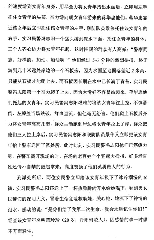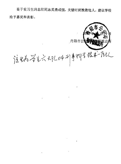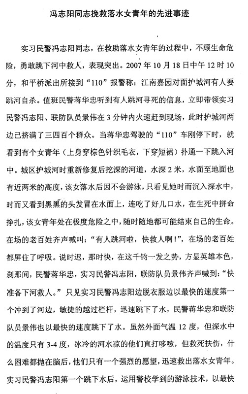 2007年10月18日12时左右,丹阳市公安局和平路派出所接到群众报警,称有人要在护城河跳河。正在和平路派出所实习的我院2004级刑技一区队学生冯志阳在值班民警的带领下迅速赶到现场,发现一名女青年已落入河中。落水者由于不会游泳,在水中几经沉浮,生命处于极度危险之中。冯志阳第一个冲到河边,奋不顾身跳入2米多深的护城河中,快速游到落水者身边,奋力将她托出水面。冯志阳与随后下水的民警和联防队员一起,奋力拼搏,终于将落水者营救上岸。在救援过程中,冯志阳不慎滑倒,左膝盖受伤,鲜血直流,但他全然不顾。现场数百名群众以热烈的掌声表达对人民警察的敬意。