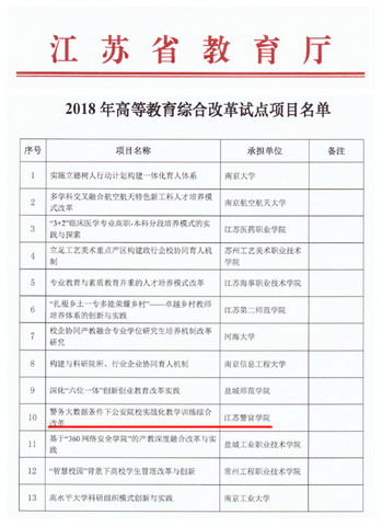 日前,省教育厅下发《关于公布2018年高等教育综合改革试点项目的通知》(苏教法函﹝2018﹞4号),我院申报的《警务大数据条件下公安院校实战化教学训练综合改革》(负责人:夏存喜,张兰青)项目被确立为20个正式项目之一。