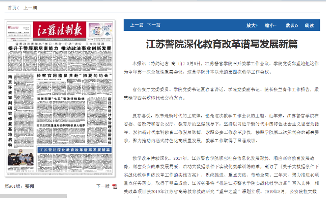教学改革持续深化。2017年,江苏警官学院顺应社会信息化发展形势,顺应高等教育发展趋势,顺应公安改革发展需要,启动大数据条件下实战化教学训练改革,制订了《关于大数据条件下实战化教学训练改革工作的实施方案》,系统推进、重点突破、带动全局。三年来,聚力推进40项重点任务落实,取得了明显成效。江苏省委将“推进江苏警官学院实战化教学改革”写入文件,相关改革项目获2019年江苏省高等教育教改研究“重中之重”课题立项。2019年8月,公安院校大数据条件下实战化教学改革论坛在江苏警官学院成功举办。