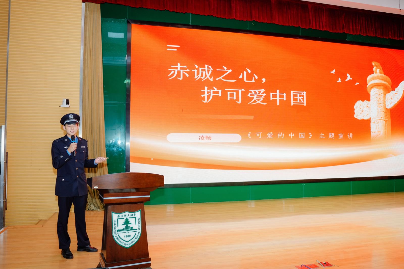 宣讲已近尾声,江苏警官学院合唱团暨蓝丝带宣讲团的学警们与南京师范大学附属中学新城初级中学的同学们登台合唱《我的祖国》,歌声响彻云霄,一曲结束,掌声经久不息......