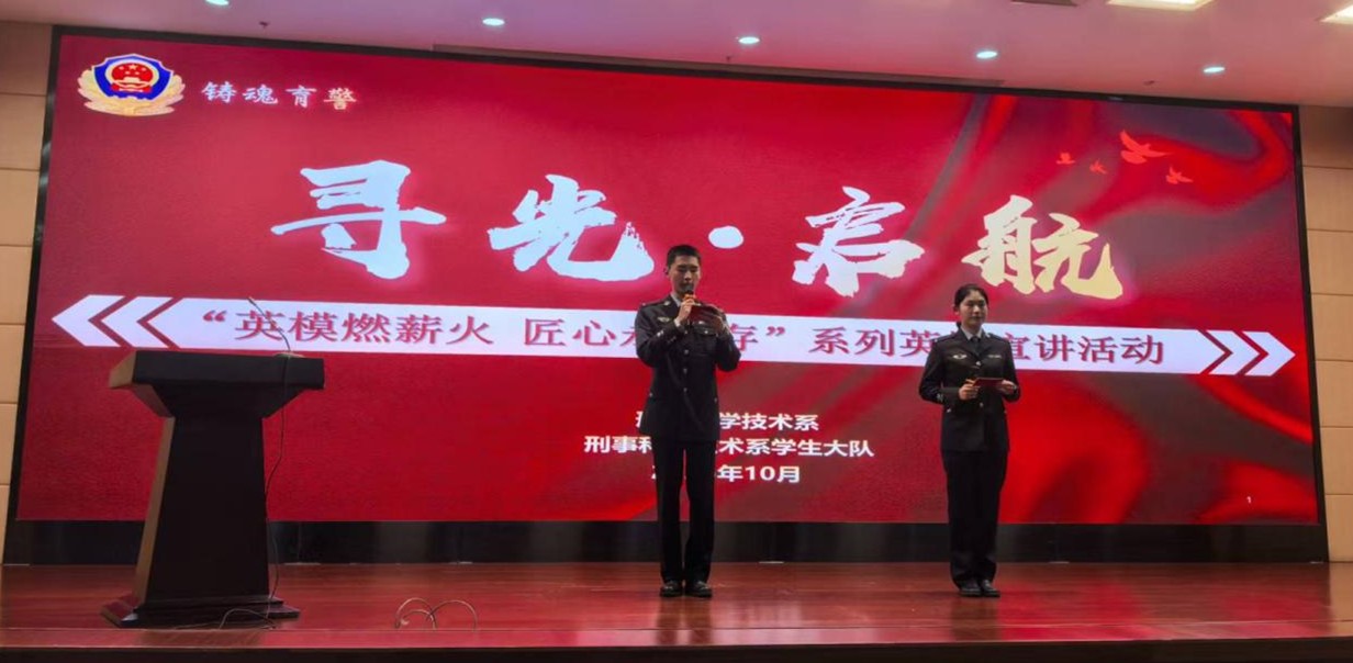 为弘扬英模精神,传承红色基因,10月14日晚,刑事科学技术系暨学生大队在学院报告厅举办“英模燃薪火 匠心永留存”——“寻光·启航”系列英模精神宣讲活动之大一新生专场。学院党委委员、副院长刘蔚文出席活动,刑事科学技术系、学生处负责同志、部分干部教师及2025级新生共280余人参加。