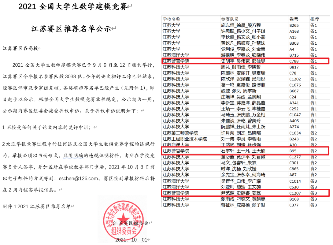 近日,2021年全国大学生数学建模竞赛获奖名单揭晓,我院计算机信息与网络安全系梁广俊老师指导的史明宇、吴伟豪、郭佳樊获江苏省一等奖,石宇轩、王一凡、王天楠获江苏省二等奖,钱汉伟老师指导的尹艺源、史翩睿、姜磊获江苏省三等奖。