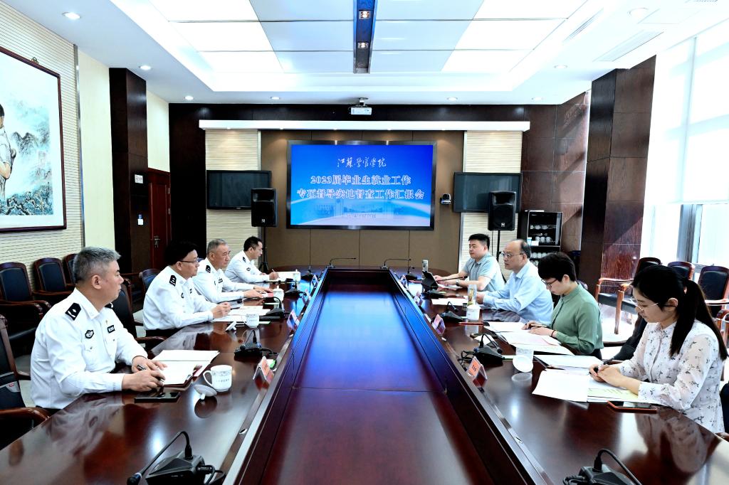 受省公安厅党委委员、学院党委书记夏存喜、学院党委副书记、院长张兰青委托,殷竹钧代表学院党委行政从工作机制、条件保障、市场建设、指导服务、就业管理等方面向督查组汇报了我院2023届毕业生就业工作。