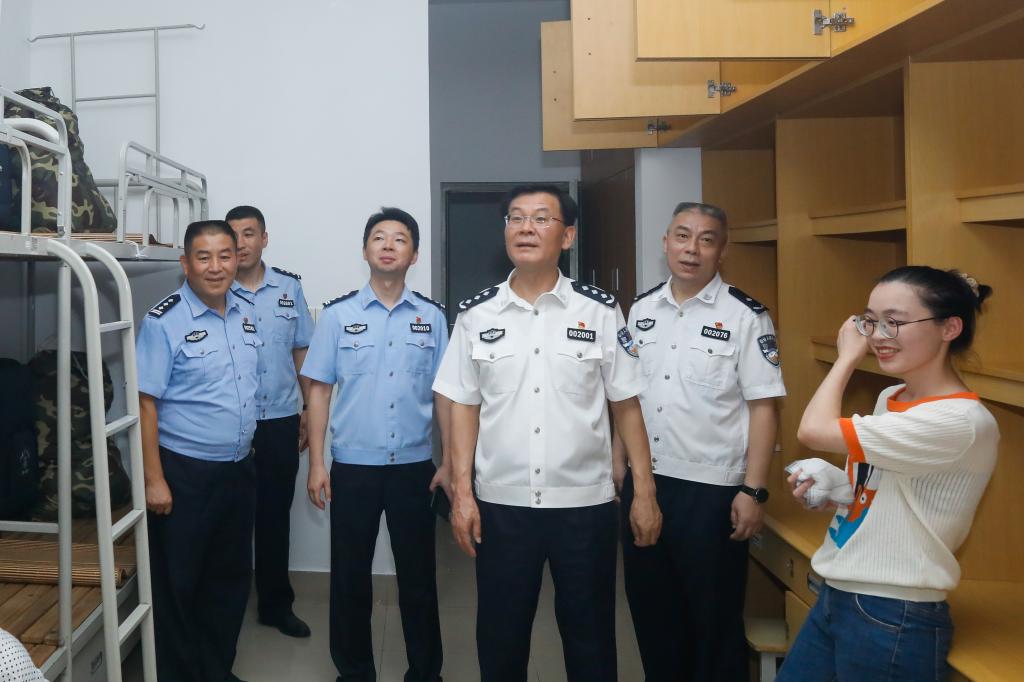 报到期间,省公安厅党委委员、学院党委书记夏存喜,学院党委副书记、院长黄进,学院党委委员、副院长张敏,深入报到现场、被装发放处、新生宿舍,实地检查报到登记、绿色通道和接待服务保障等工作,查看新生军训物品发放和新生入住情况,并和新生、家长交流,要求参加迎新工作的师生全力投入、热情接待、精益求精,充分展示学院良好形象。
