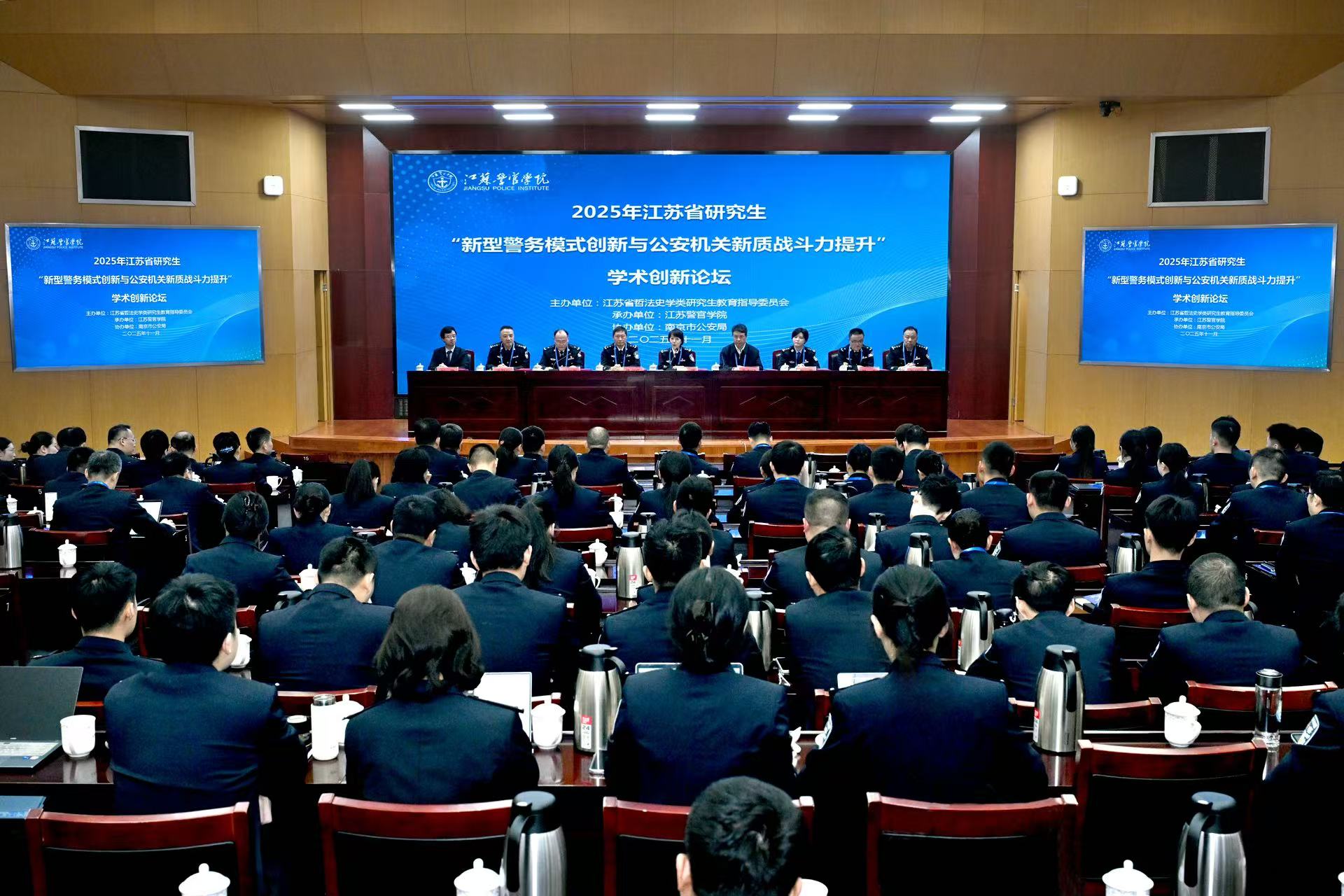 11月15日,2025年江苏省研究生“新型警务模式创新与公安机关新质战斗力提升”学术创新论坛在江苏警官学院成功举办。学院党委副书记、院长黄进出席论坛并致辞,省哲法史学类研究生教育指导委员会主任委员、南京邮电大学校长叶美兰线上致辞。论坛开幕式由学院党委委员、副院长冯红新主持。省哲法史学类研究生教育指导委员会秘书长朱奎泽,以及南京大学政府管理学院、江苏省公安厅组宣处、江苏省公安厅科信总队、南京市公安局、昆山市公安局等单位有关领导出席论坛。全国10所相关院校,200余名专家学者和师生代表参加论坛。