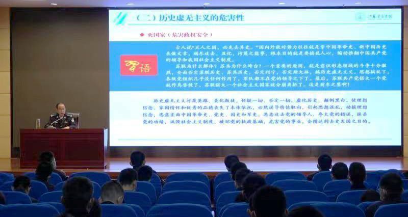 授课中,张兰青以丰富的事例为佐证,给学生讲述了历史虚无主义在政治、历史、文化等领域的主要表现形式,剖析了历史虚无主义产生的原因及价值基础,揭示了历史虚无主义的本质和危害性,要求同学们旗帜鲜明地反对历史虚无主义。