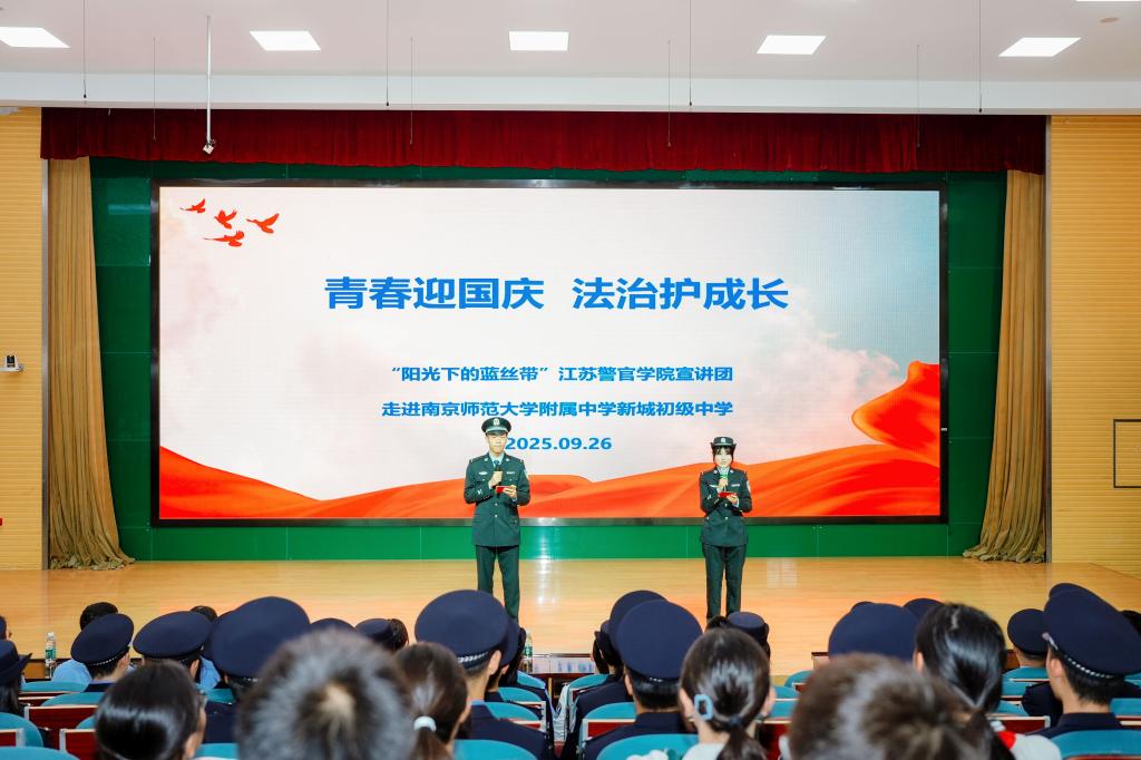 2025年9月26日,为迎接新中国成立76周年,深入贯彻落实江苏省公安厅“苏警安新”未成年人安全守护工程,“阳光下的蓝丝带”江苏警官学院宣讲团走进南京师范大学附属中学新城初级中学,为初二年级900余名同学开展“青春迎国庆 法治护成长”主题宣讲。本次活动旨在通过专业知识宣讲与大中学生互动,以“警察蓝”守护成长,用“法治伞”护航未来,让青少年在国庆氛围中感悟家国担当,在法治教育中筑牢安全防线,切实增强法治意识、安全意识和爱国情怀。